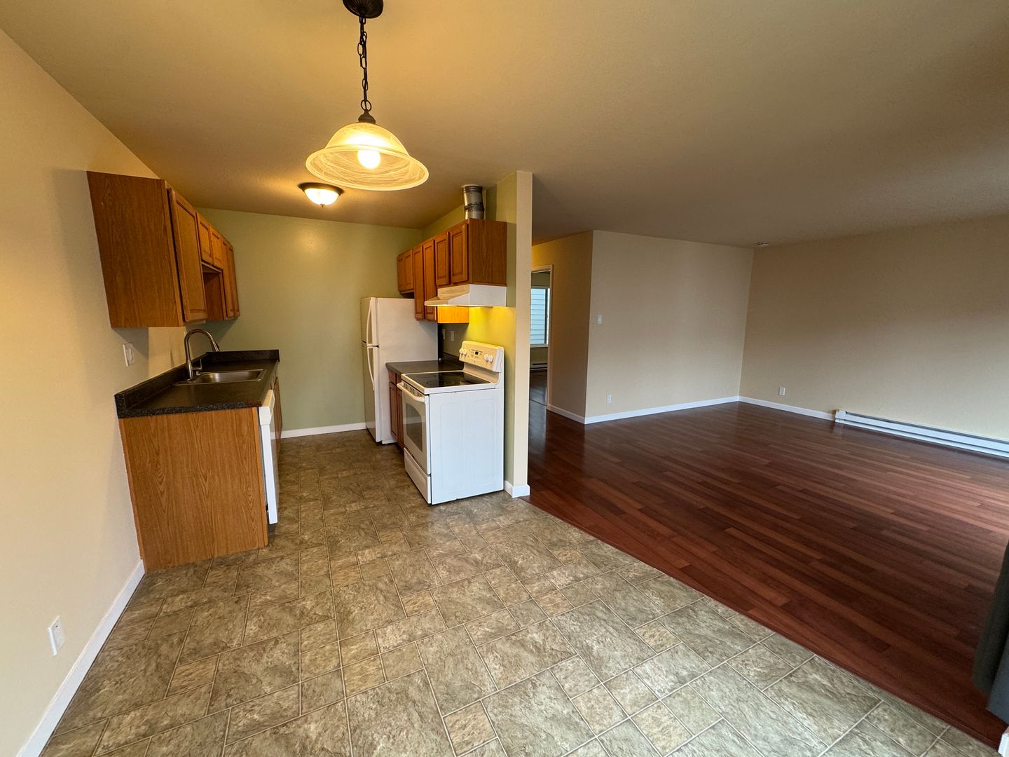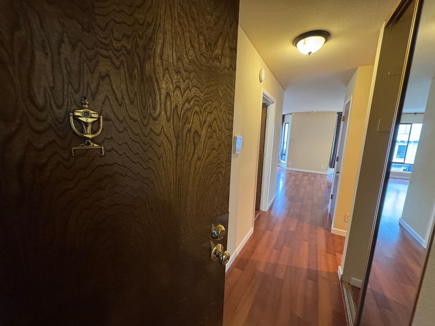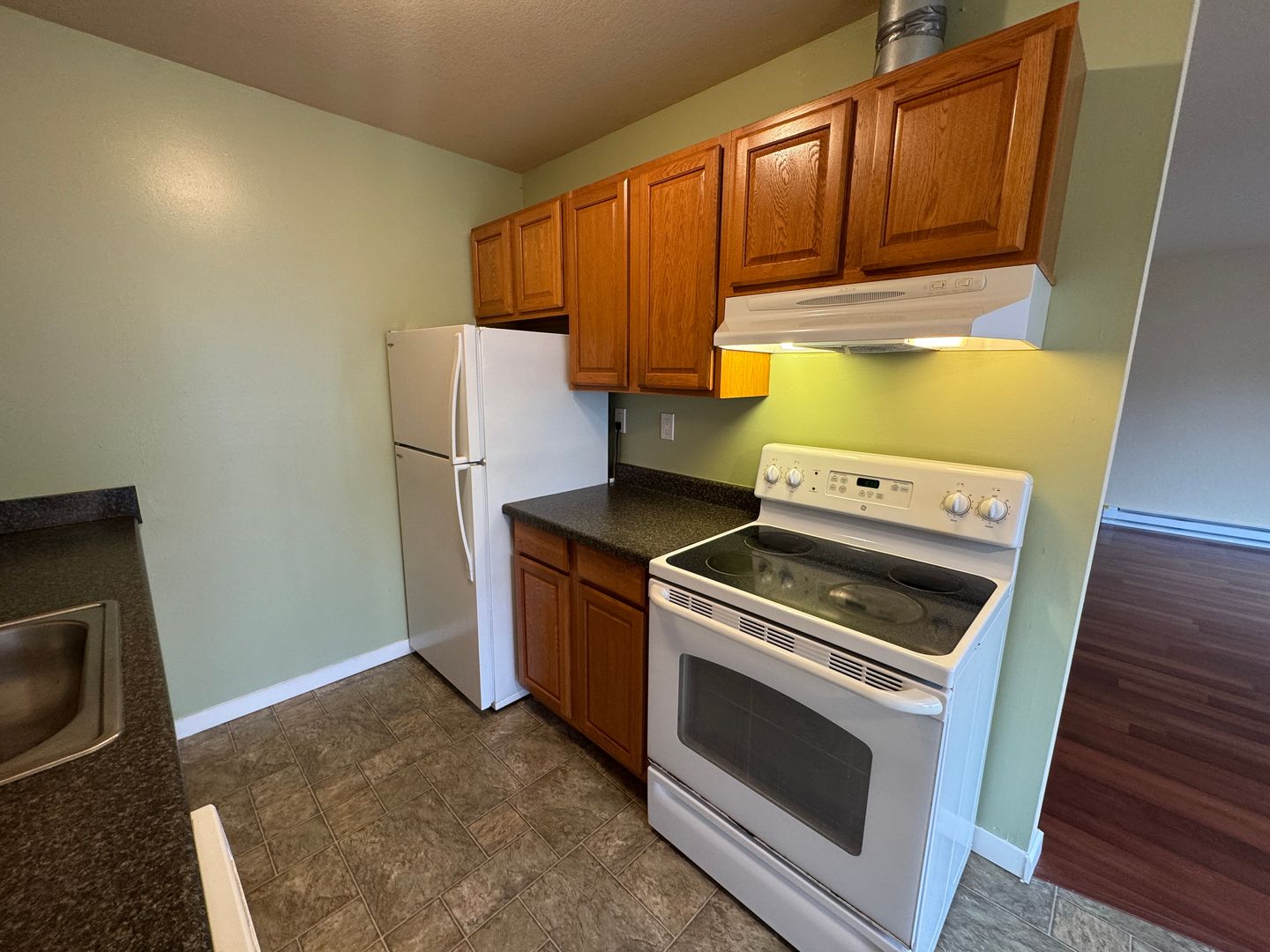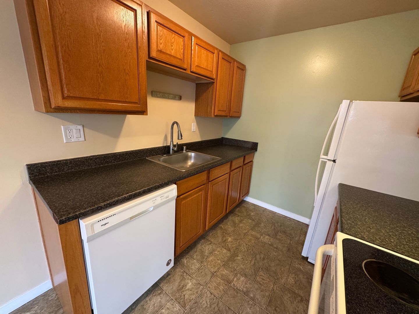 Fully equipped kitchen with garbage disposal, dishwasher, refrigerator, and electric stove and oven. Beautiful granite countertops plus good kitchen cabinet space and a separate the dining area. Large bay windows in the livingroom. Expansive living room with two hallway closets. Laminated wood flooring throughout. Newer remodeled bathroom with tile floors. Bedrooms with good closet space, facing the center of the building. Quiet and lots of natural sunlight. 1 garage parking space included.