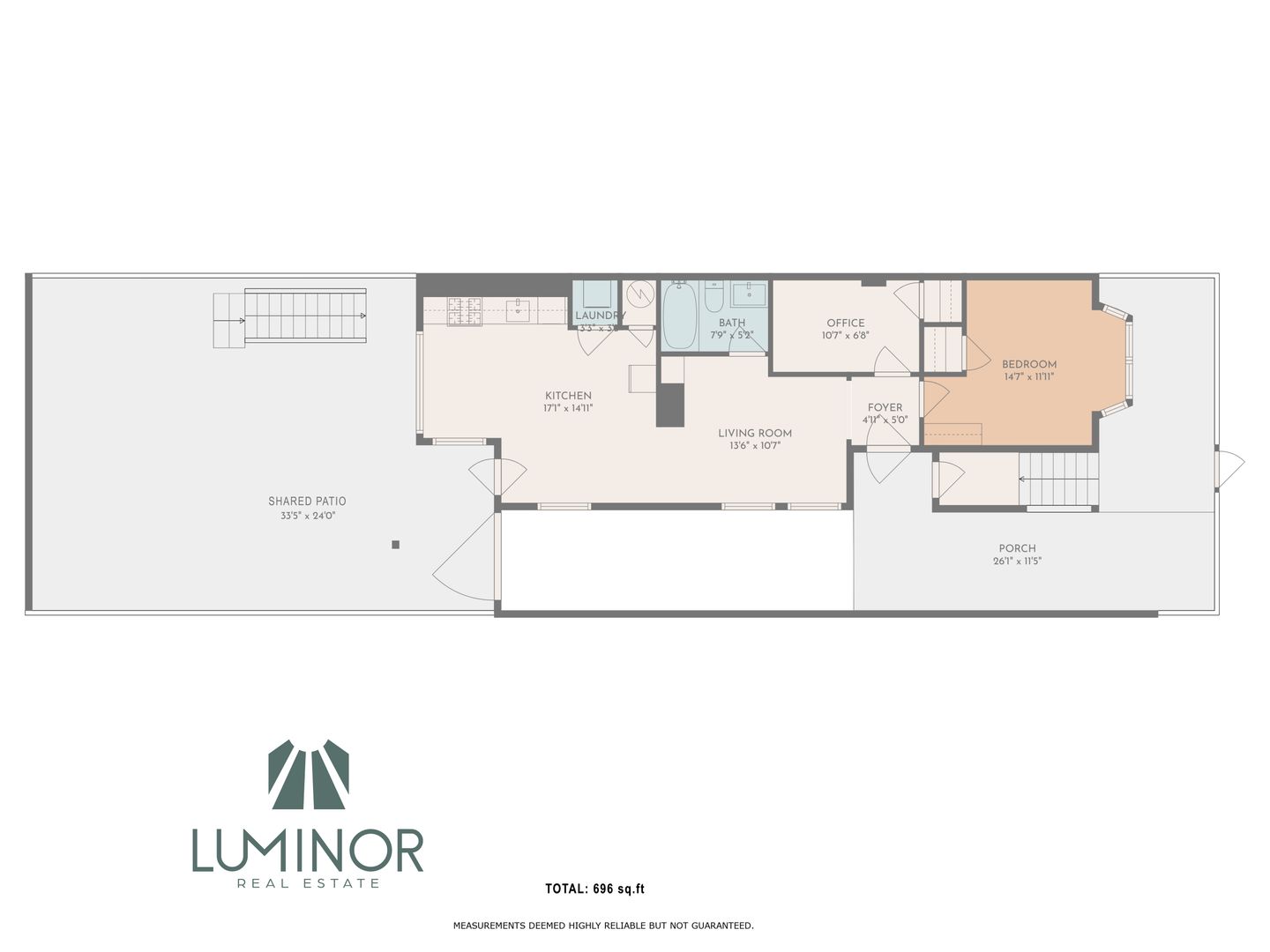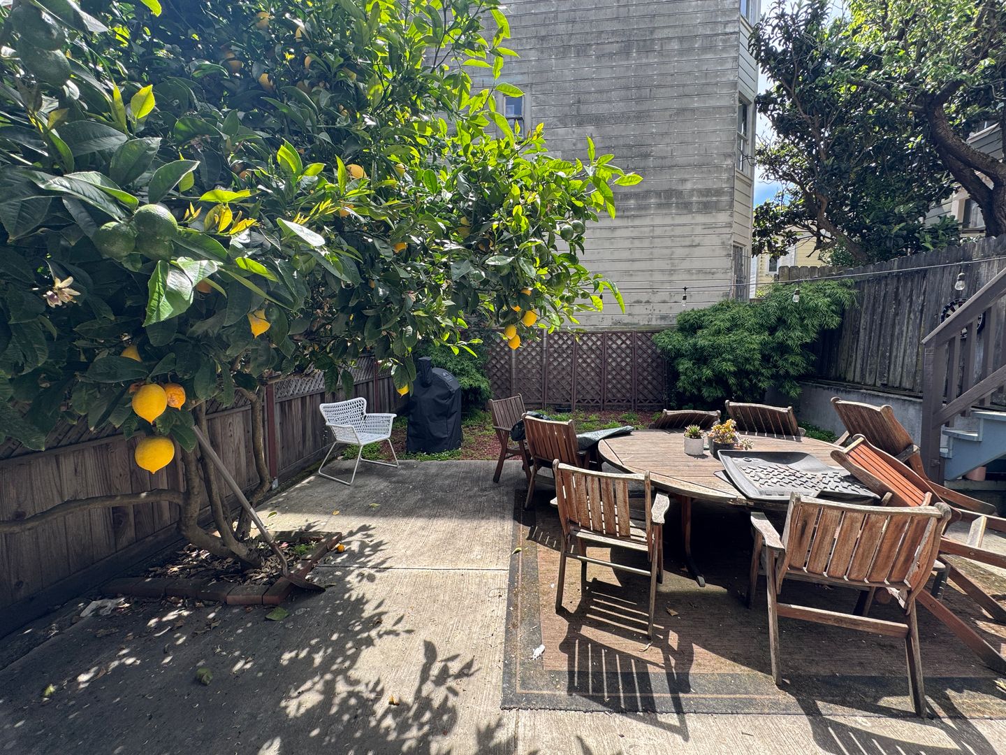 The bedroom is generously sized, while the separate office provides an ideal work-from-home setup or creative space. Kitchen overlooking the Shared patio with a lemon tree and plenty of outdoor seating. The updated bathroom includes a full tub and contemporary finishes.