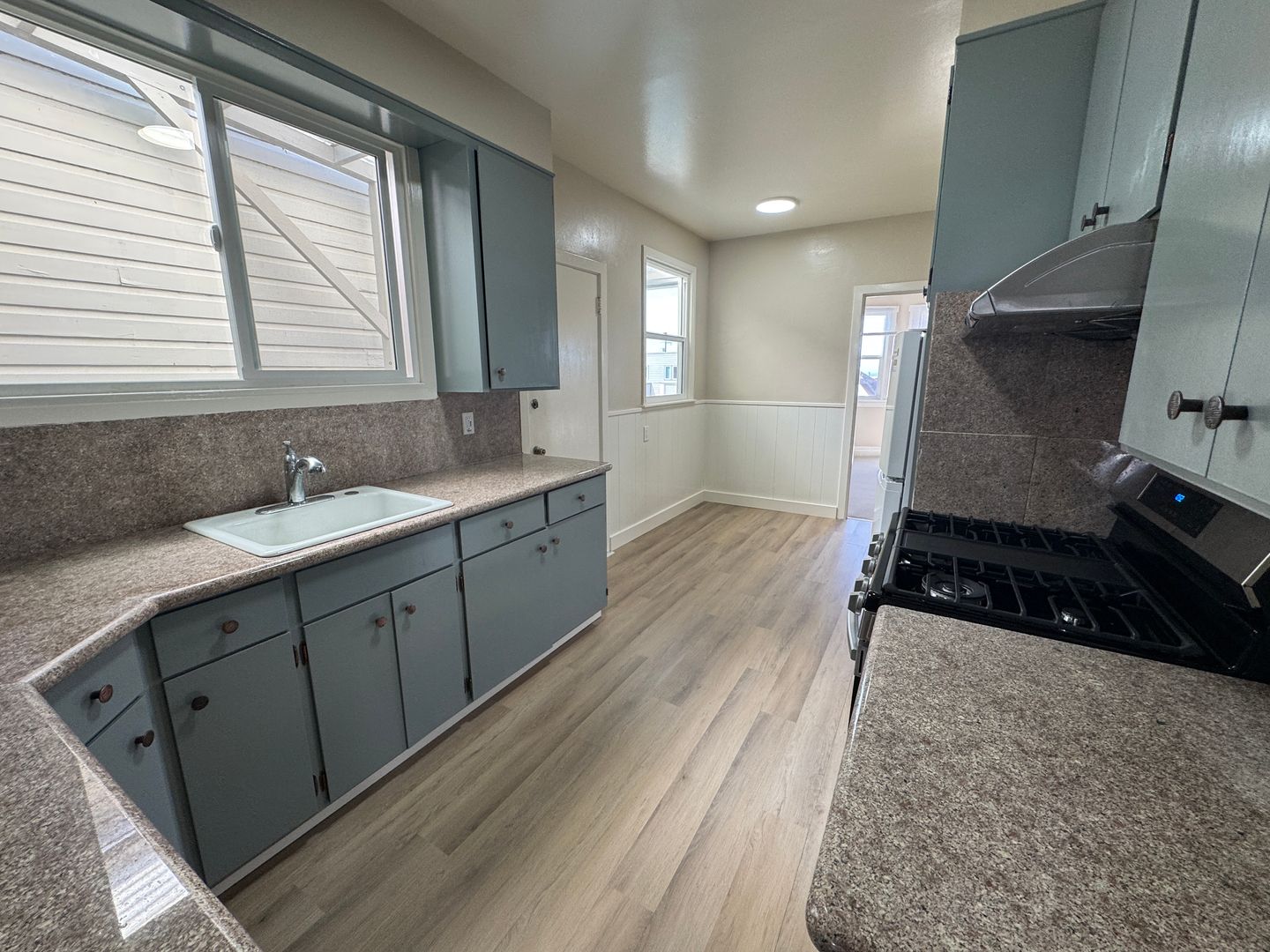 The updated eat-in kitchen boasts granite counters, gas range, and ample storage, flowing into a formal dining room perfect for gatherings. Two generous bedrooms include a primary with west facing windows; the modern bathroom features a glass shower and tiled floors. Washer and Dryer in the garage, a deck balcony, and backyard access.
